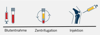 Autologes plättchenreiches Plasma ist eine innovative Therapiemöglichkeit zur Behandlung von Osteoarthrose (auch bekannt als „Eigenbluttherapie“). Hierbei werden 5ml Blut entnommen, das mit einer nicht-vernetzten Hyaloronsäure vermengt und zentrifugiert wird. Es entsteht anschließend ein Gemisch, das aus dem wässrigen Anteil des Blutes („Plasma“ und den darin gelösten Wachstumsfaktoren, Vitamine, Mineralien, Proteine, Elektrolyte etc.), den Blutplättchen („Thrombozyten“) sowie der speziellen Hyaloronsäure. Dieses Gemisch wird sofort nach der Herstellung in unserem Eingriffsraum in der Praxis unter sterilen Bedingungen in das betroffene Gelenk gespritzt.